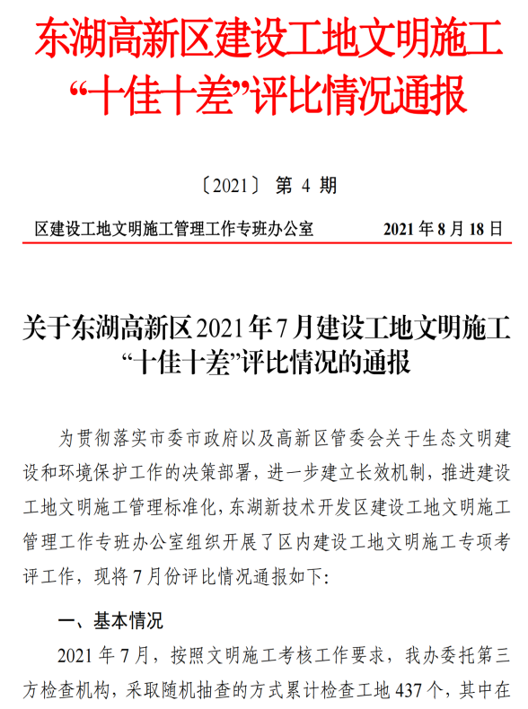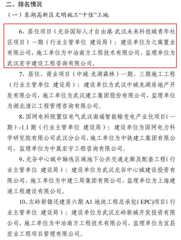 根据东湖新技术开发区建设工地文明施工管理工作专班办公室组织开展的区内建设工地文明施工专项考评,之寓未来(武汉未来科技城青年社区)项目被评为2021年7月东湖高新区文明施工“十佳”工地。