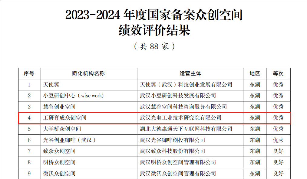 在国家备案众创空间绩效评价中,光谷产投运营的“工研育成众创空间”获评“优秀”;在省级众创空间绩效评价中,智装院运营的“智能装备众创空间”、新能源研究院运营的“马蹄莲创新中心”获评“优秀”。