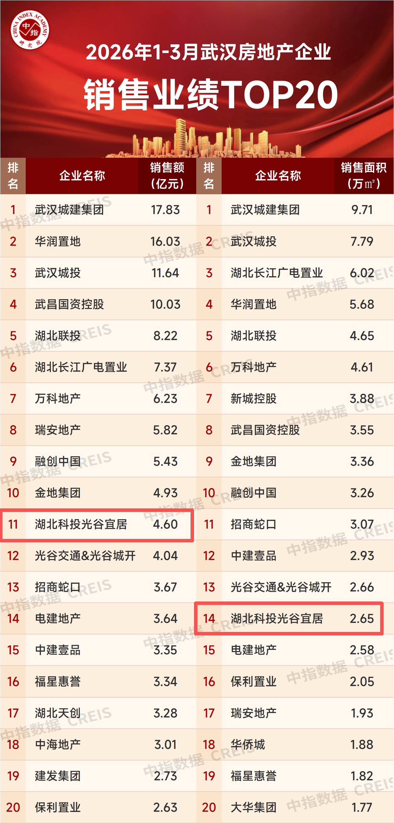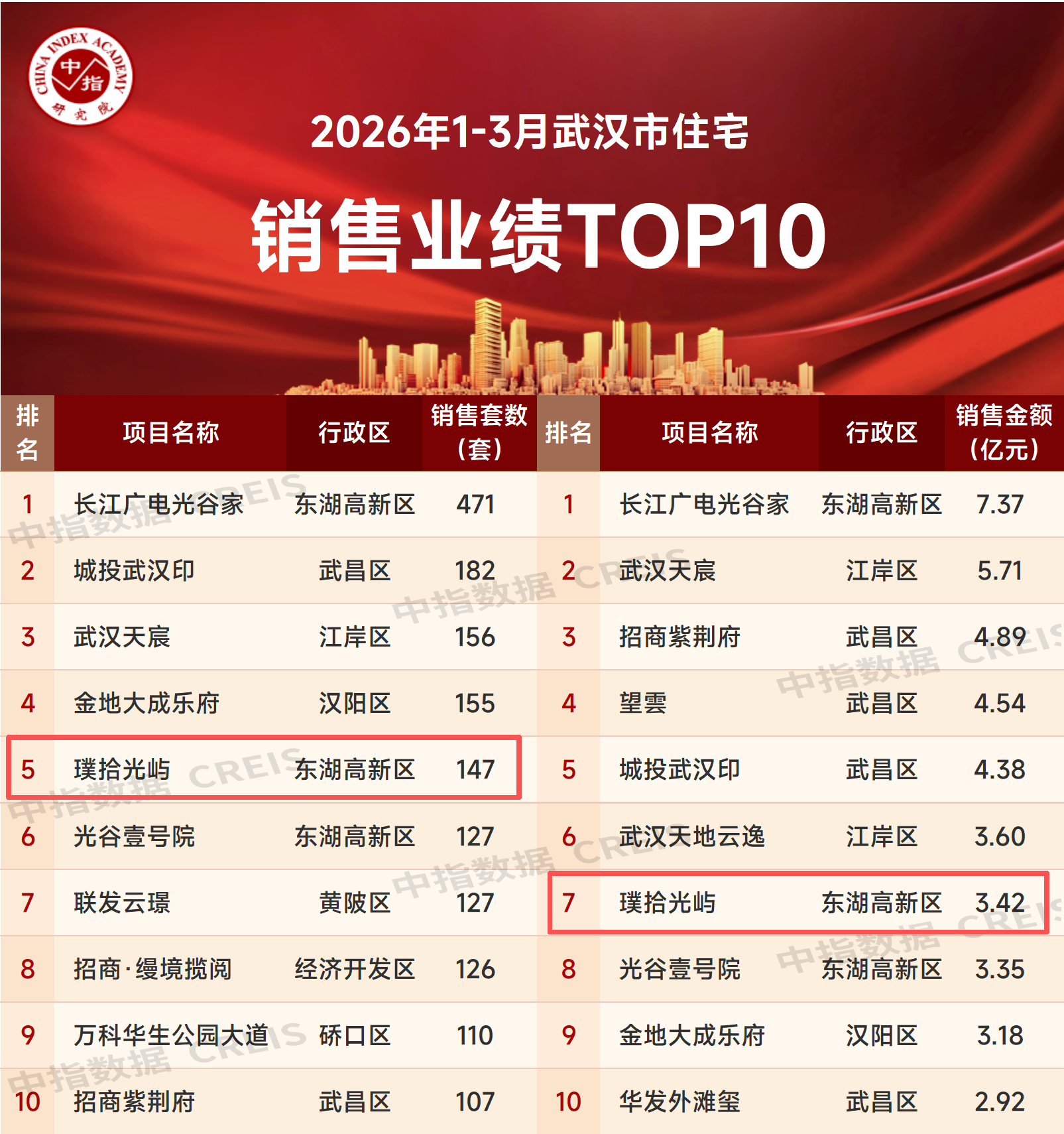 近日,中指研究院发布了《2026年1-3月武汉房地产企业销售业绩TOP20》榜单。在中指研究院榜单中,皇冠娱乐 旗下光谷宜居公司1-3月全口径销售面积、销售金额指标均位居前列;璞拾光屿作为今年入市新盘,去化表现不凡,在2026年1-3月武汉市住宅销售套数TOP10中排名第五,赢得广泛的市场与客户认可。