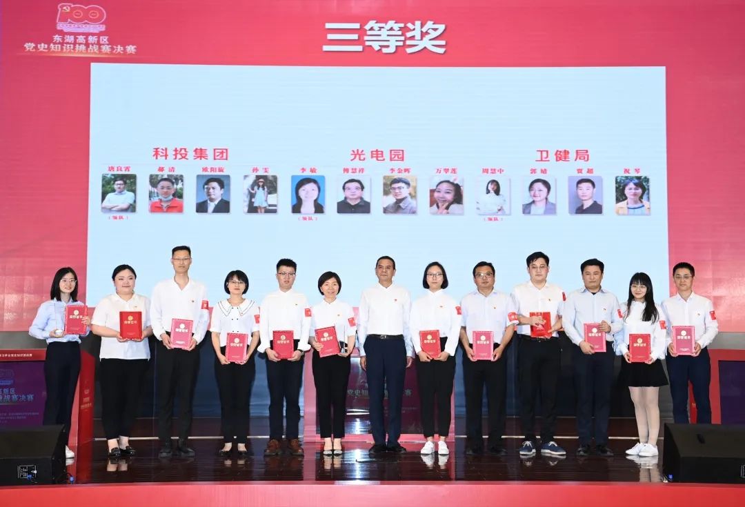 5月21日下午,东湖高新区党史知识竞赛挑战赛决赛举行,市纪委监委派出东湖高新区纪检监察工委书记李军,市委宣传部副部长、市党史学习教育办公室宣讲工作组组长吴天勇,东湖高新区管委会副主任宋治平、张传远,东湖高新区管委会总经济师李首文,东湖高新区党工委政法委副书记曾祥华,市工科院党委书记、院长程百炼出席活动。